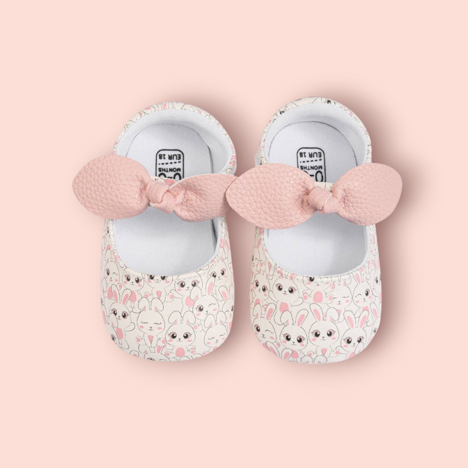 These baby shoes feature a charming bunny print with a delicate front bow, combining adorable style and gentle comfort for your little girl. Designed to provide soft support and a snug fit, they are perfect for early steps and everyday wear. The lightweight construction ensures ease of movement while keeping tiny feet protected. Ideal for adding a playful touch to any outfit, these shoes bring both functionality and sweetness to your baby's wardrobe.