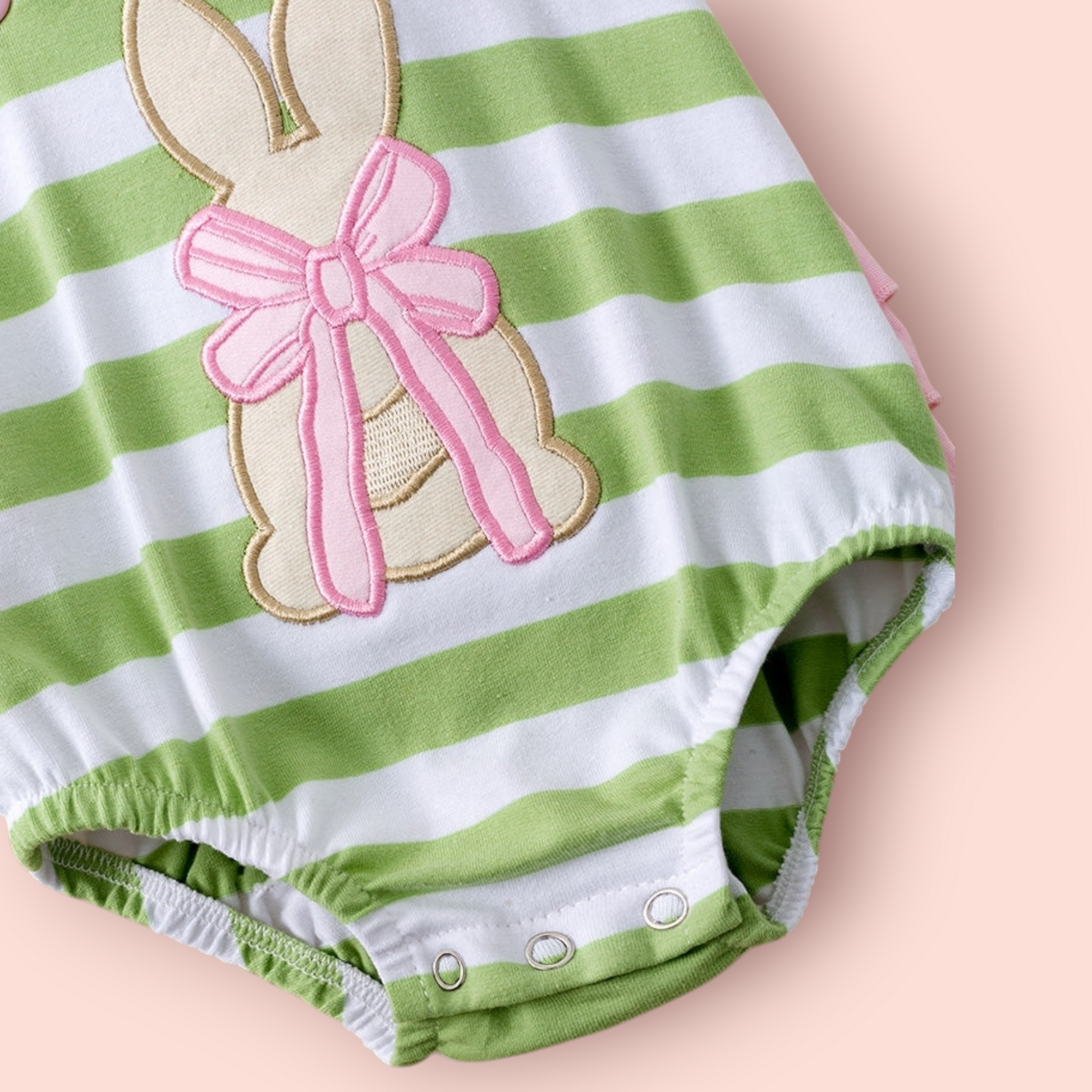 This Easter bunny appliqué romper delivers exceptional comfort and durability for delicate skin. The soft cotton foundation breathes naturally while the spandex provides gentle stretch and recovery, ensuring the garment maintains its shape through frequent washing and wear. Convenient snap closures at the shoulder and inseam simplify diaper changes and dressing. The charming green and white striped print with Easter bunny appliqué detail makes this piece both practical and festive for spring celebrations.